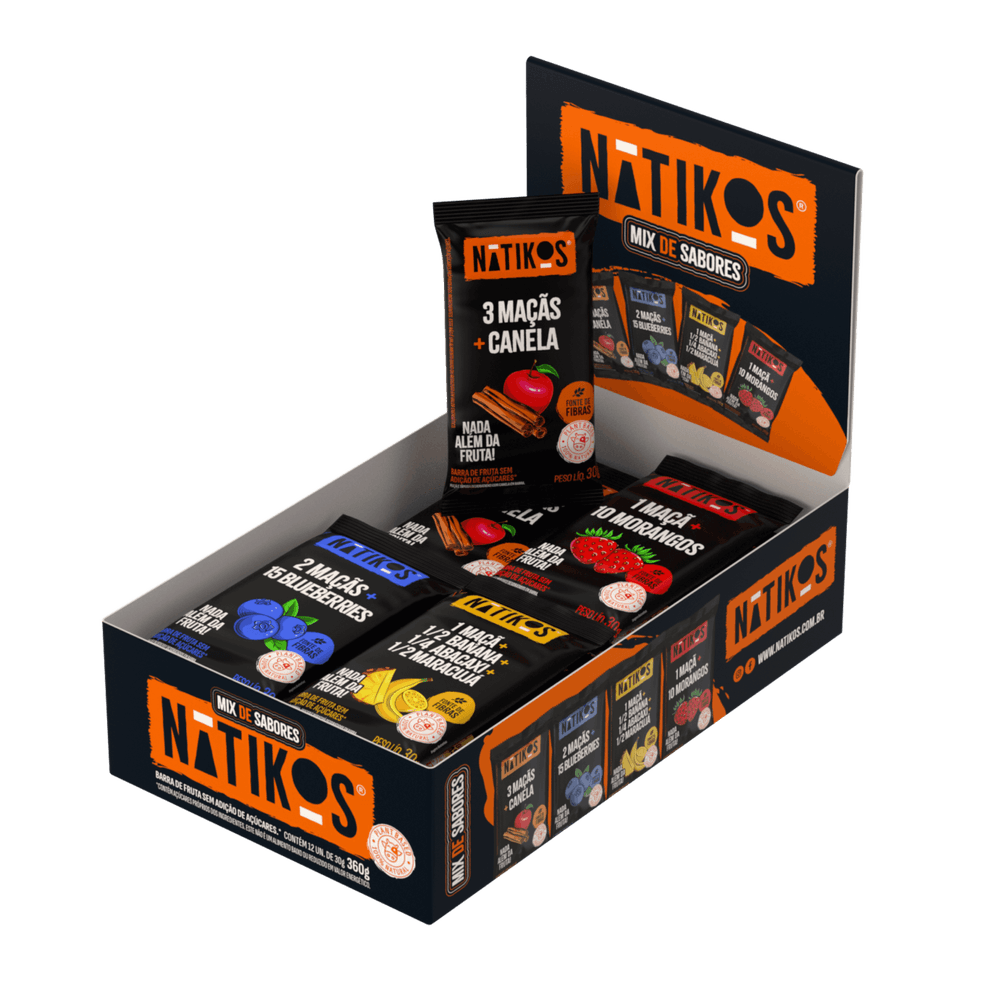 | Mix de Maçã, Banana, Abacaxi e Maracujá | Cada barra contém: 1 maçã + ½ banana + ¼ abacaxi + ½ maracujá em uma barra de fruta. Ingredientes: Maçã, banana, abacaxi e maracujá desidratados. |