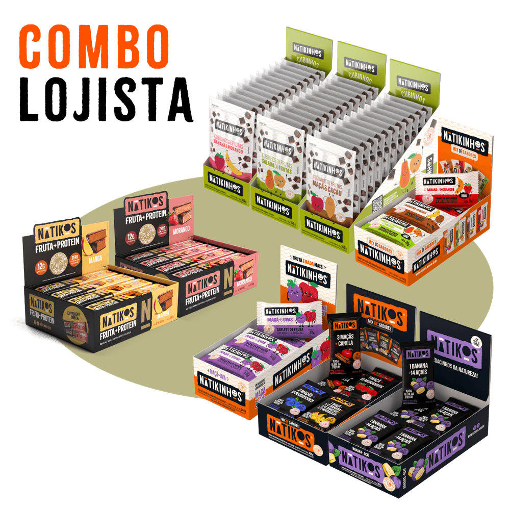 | Mix de Maçã, Banana, Abacaxi e Maracujá | Cada barra contém: 1 ½ maçã + ½ banana + ½ fatia de abacaxi + ½ maracujá em uma barra de fruta Ingredientes: Maçã, banana, abacaxi e maracujá desidratados. |