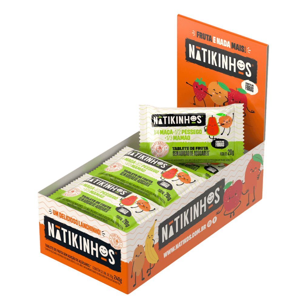 | Salada de Frutas | Cada Tablete contém 1/4 de maçã, 1/2 Pêssego, e 1/3 mamão Ingredientes: Maçã, pêssego e mamão desidratados com uva passa. |